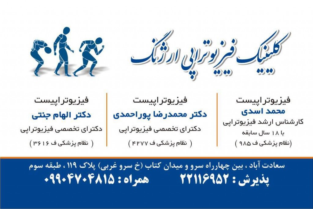 کلینیک فیزیوتراپی ارژنگ در شهر تهران به آدرس تهران، سعادت آباد، چهار راه سرو، به سمت میدان کتاب، مقابل بانک پارسیان، پلاک 119، طبقه 3 و از دسته بندی فیزیوتراپی می باشد.
