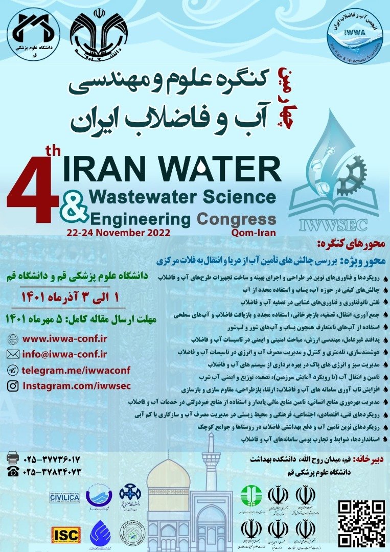 چهارمین کنگره علوم و مهندسی آب و فاضلاب ایران در تاریخ ۱ آذر ۱۴۰۱ توسط دانشگاه علوم پزشکی قم، دانشگاه قم،انجمن آب و فاضلاب ایران در شهر قم برگزار خواهد شد.با توجه به اینکه این همایش به صورت رسمی برگزار می گردد، کلیه مقالات این کنفرانس در پایگاه سیویلیکا و نیز کنسرسیوم محتوای ملی نمایه خواهد شد و شما می توانید با اطمینان کامل، مقالات خود را در این همایش ارائه نموده و از امتیازات علمی ارائه مقاله کنفرانس با دریافت گواهی کنفرانس استفاده نمایید.