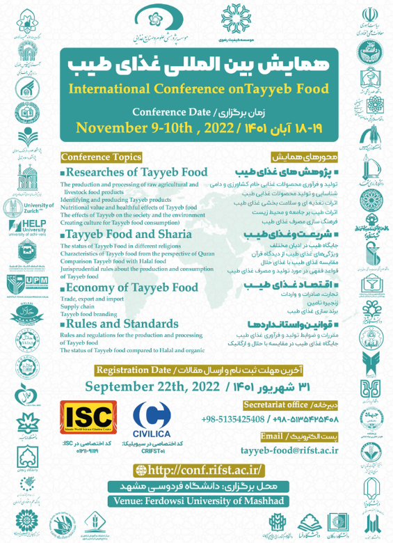 همایش بین المللی غذای طیب در تاریخ ۱۸ آبان ۱۴۰۱ توسط موسسه پژوهشی علوم و صنایع غذایی،موسسه کیفیت رضوی در شهر مشهد برگزار خواهد شد.با توجه به اینکه این همایش به صورت رسمی برگزار می گردد، کلیه مقالات این کنفرانس در پایگاه سیویلیکا و نیز کنسرسیوم محتوای ملی نمایه خواهد شد و شما می توانید با اطمینان کامل، مقالات خود را در این همایش ارائه نموده و از امتیازات علمی ارائه مقاله کنفرانس با دریافت گواهی کنفرانس استفاده نمایید.